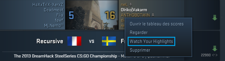 Une fois téléchargée, la GOTV sera dans l'onglet "Téléchargés". Si vous étiez dans la partie, vous pouvez revoir les temps fort de votre match :