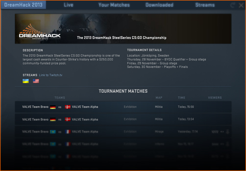 Ainsi le menu "Regarder" va s'enrichir d'un onglet spécifique pour la DreamHack 2013 qui affichera les matchs : équipes, cartes, stade la compétition, horaire et un lien vers la GOTV ainsi que les stream dans plusieurs langues.