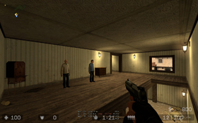 La partie basse de la maison à otages. Des otages qui ont d'ailleurs une allure de prisonniers, combinaison orange et mains liées. A côté de cela, ils ont l'air d'avoir gagné en dextérité dans leurs mouvements puisqu'ils sautent avec fière allure, mais pas en intelligence et restent toujours bloqués dans un escalier ...