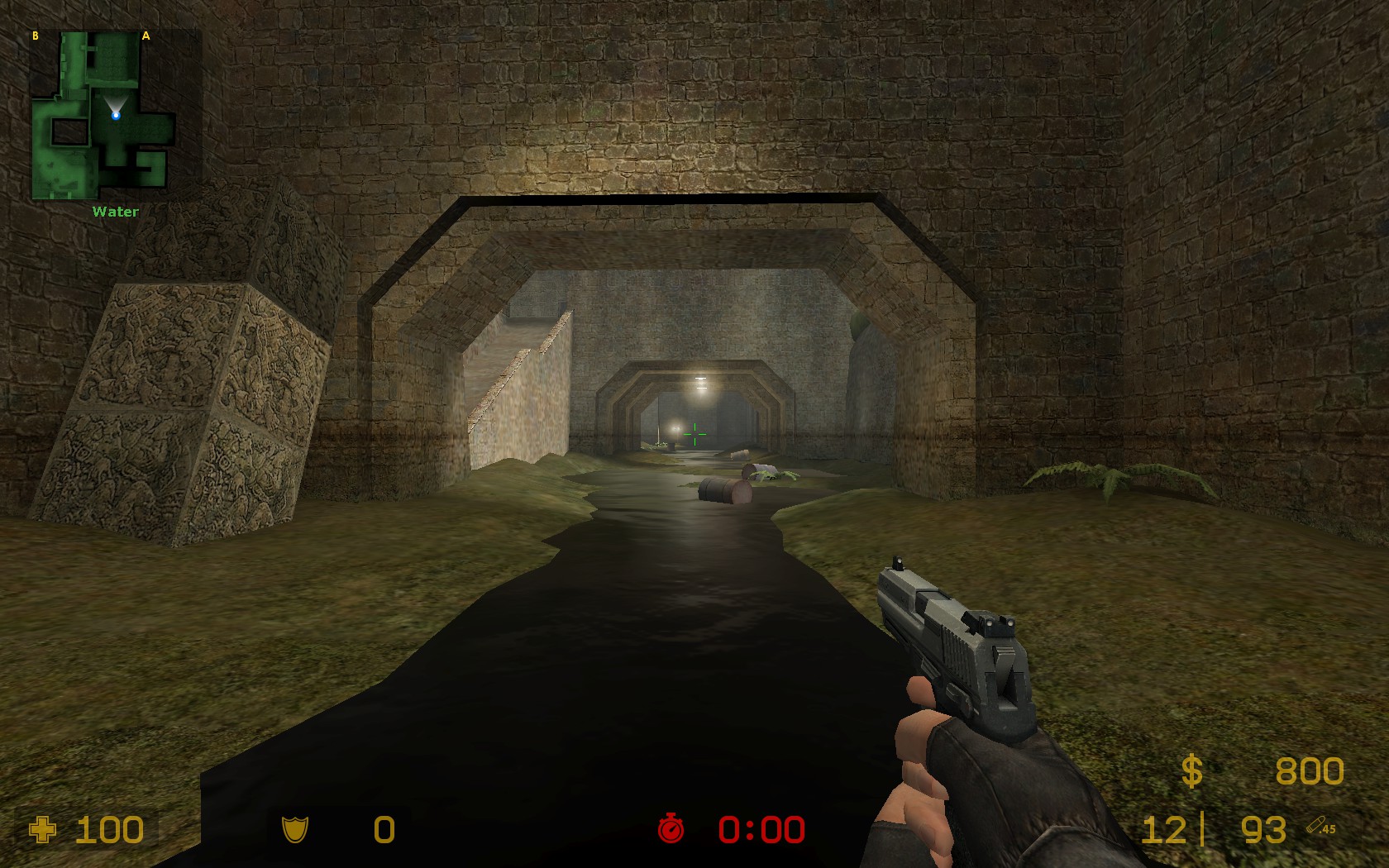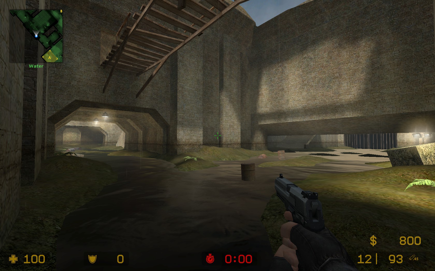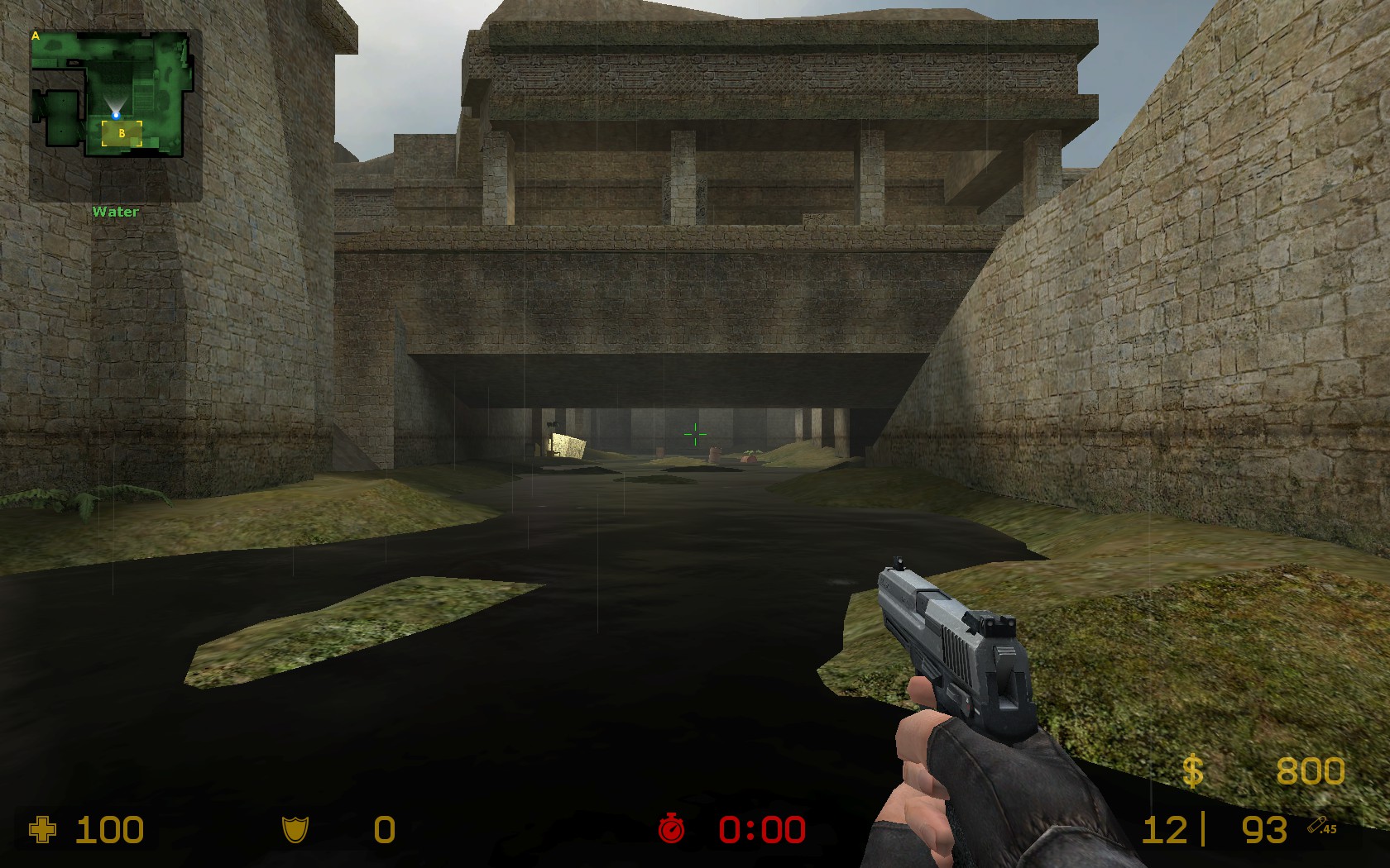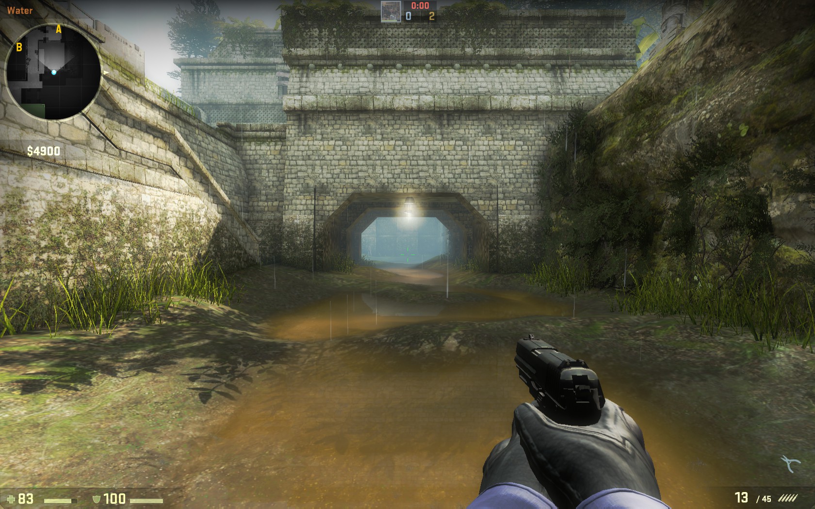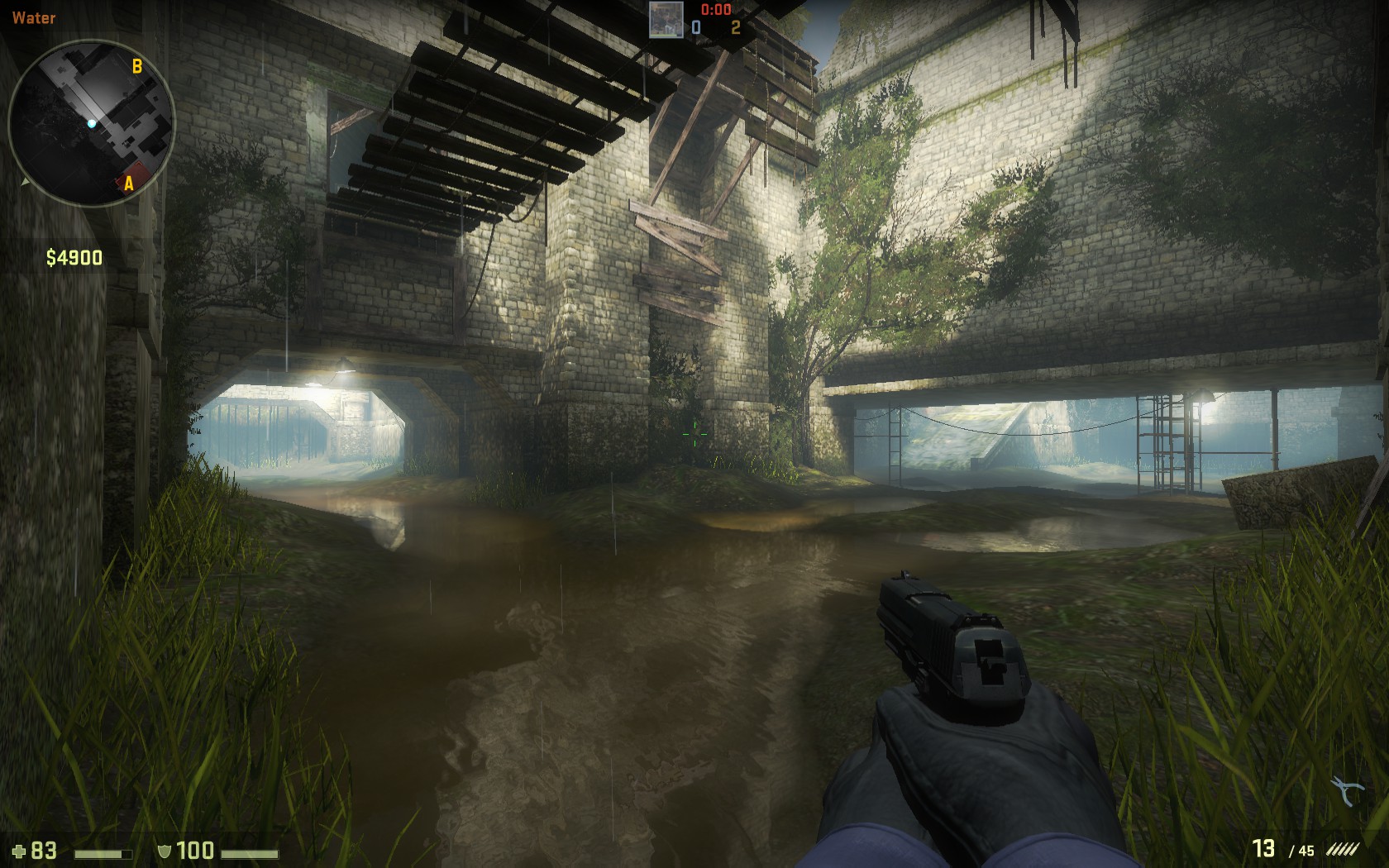 La partie basse de de_aztec composée de grandes flaques d'eau, est une alternative pour les terroristes d'atteindre les différents sites bombe. Aucun changement de taille n'est à noter en passant de Source à Global-Offensive.