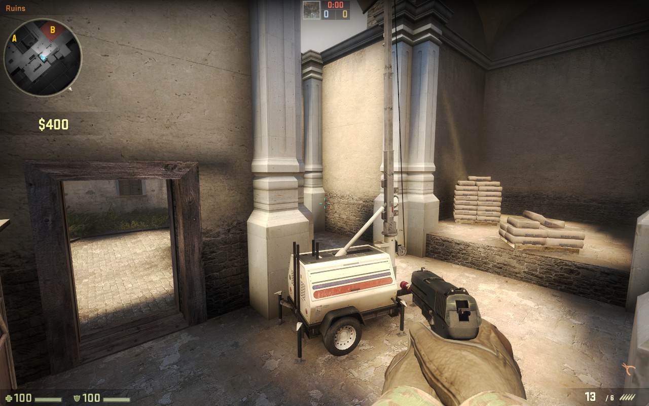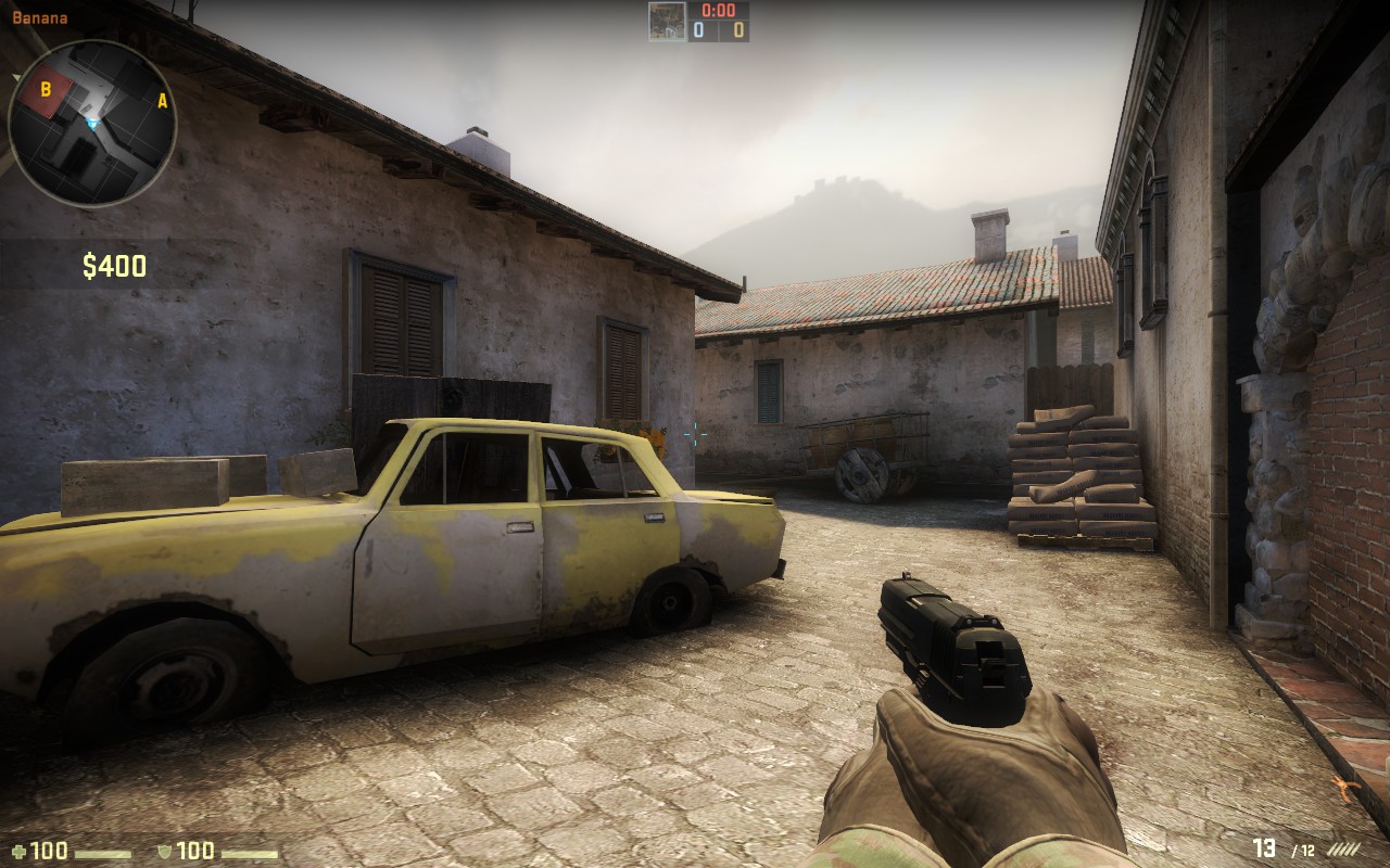 La banane qui est la partie de la carte la plus customisée sur Global Offensive. Jugée trop favorable au CT avec la voiture jaune et cette série de colonnes limitant la vision, la banane a dorénavant un mur en pierre pour bloquer la vision du côté CT.