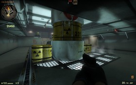 La reprise du bombesite B par la pente s'avère plus ardue sur CS:GO avec l'ajout de tonneaux toxiques permettant de se couvrir plus facilement. Remarquons aussi l'absence de vitres dans la porte de l'antitox.