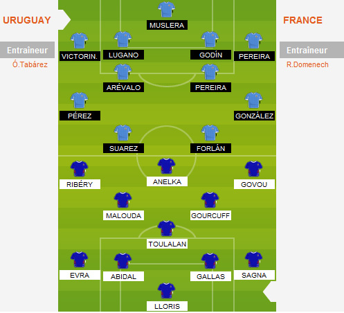 Sagna - Gallas - Abidal - Evra--- -----------Toulalan-------------- ----ribery--------------Malouda---- -------Diaby -----gourcuff------ -------------valbuena--------------